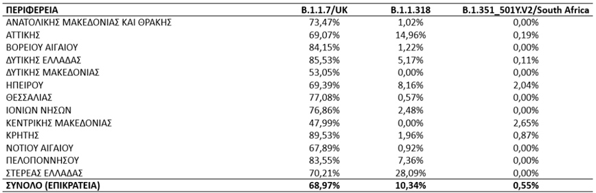 Από την έναρξη λειτουργίας του Εθνικού Δικτύου Γονιδιωματικής Επιτήρησης του ιού SARS-CoV-2 μέχρι σήμερα έχουν ελεγχθεί στην επικράτεια συνολικά 14.240 δείγματα από εγχώρια κρούσματα, εκ των οποίων τα τρία πιο συχνά στελέχη ειδικού ενδιαφέροντος ή υπό διερεύνηση που έχουν απομονωθεί είναι το Β.1.1.7/UK lineage (Variant VOC 202012/01), με ποσοστό 68,97%, ακολουθούμενο από το B.1.1.318 (Variant E484K) με ποσοστό 10,34% και το B.1.351/501Y.V2/South Africa (Variant VOC 202012/02) με ποσοστό 0,55%.