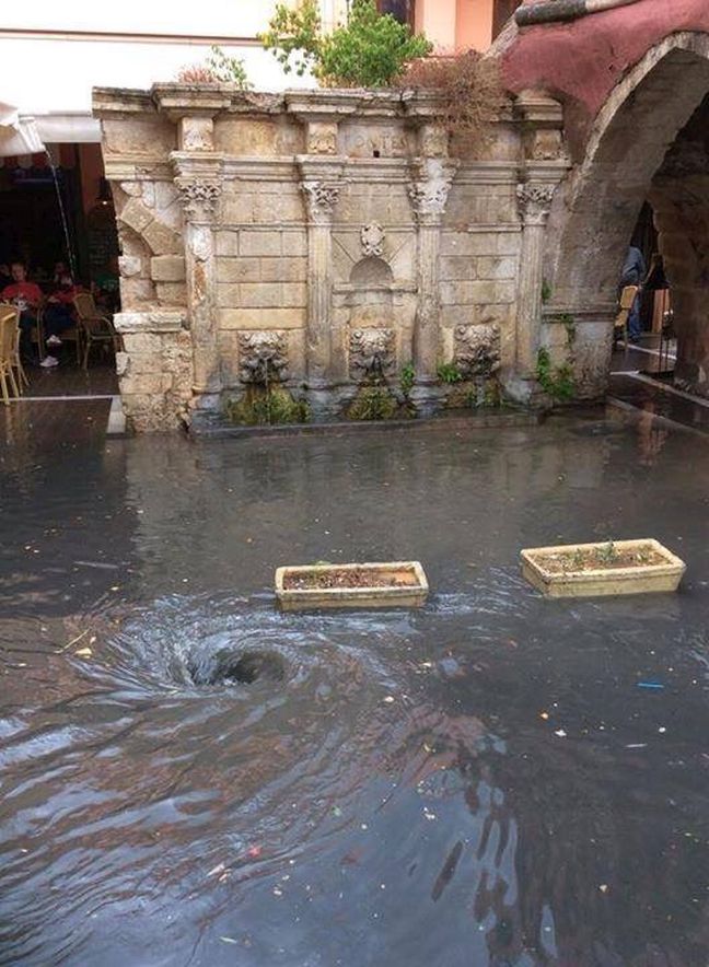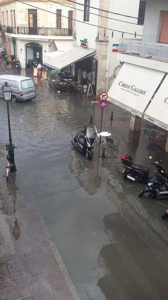 Η καταρρακτώδης βροχή που έπεσε μέσα σε λίγα λεπτά στην πόλη του Ρεθύμνου, την Παρασκευή, προκάλεσε πολλά προβλήματα κυρίως στην παλιά πόλη, δρόμοι της οποίας κατακλύστηκαν απο τα νερά.