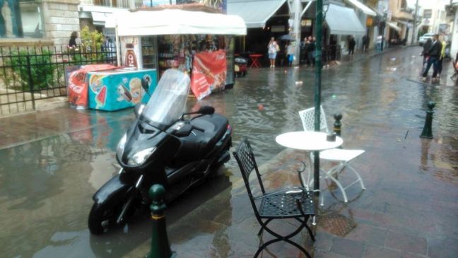 Η κυκλοφορία των οχημάτων γινόταν με δυσκολία, ενώ καταστηματάρχες και κάτοικοι προσπαθούσαν να κρατήσουν τα νερά έξω απο σπίτια και επιχειρήσεις.