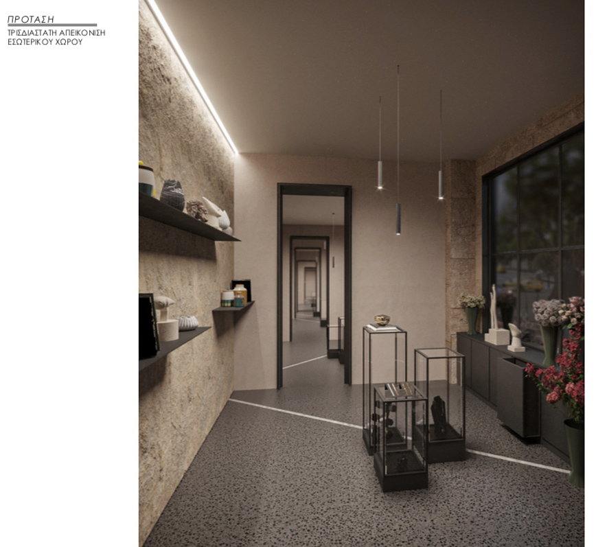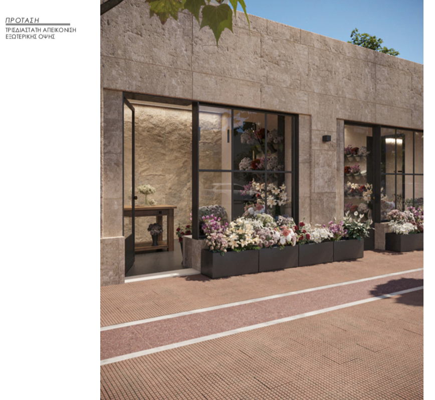 «Σύμφωνα με τη μελέτη αναδιαρρύθμισης των καταστημάτων ανθοπωλείων της Βουλής που υλοποίησε η ΕΤΑΔ προτείνεται η λειτουργική αναβάθμιση των υφιστάμενων χρήσεων των καταστημάτων, διατηρώντας τη χρήση των ανθοπωλείων στα δύο άκρα των καταστημάτων και προσθέτοντας νέα χρήση εκθετηρίων – καταστήματος της Βουλής των Ελλήνων και του ΟΔΑΠ, καθώς και βοηθητικών λειτουργιών εξυπηρέτησης στους υπόλοιπους χώρους. Τα εκθετήρια ενοποιούνται με εσωτερικές διανοίξεις των εσωτερικών τοιχίων και διαδρόμων, ενώ η δημιουργία δύο ημιυπαίθριων τμημάτων θα επιτρέπουν την είσοδο – μετάβαση από τον δημόσιο χώρο στα εκθετήρια και στο κατάστημα.