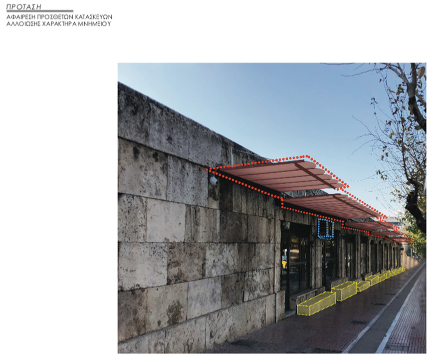 Όπως προβλέπει η αρχιτεκτονική μελέτη, αφαιρούνται οι πρόσθετες εξωτερικές κατασκευές, οι οποίες αλλοιώνουν τον χαρακτήρα του μνημείου και εκσυγχρονίζεται η κύρια όψη επί της λεωφόρου Βασιλίσσης Σοφίας, κατά μήκος των καταστημάτων. Διατηρούνται δύο ανθοπωλεία, στα δύο άκρα των καταστημάτων και προστίθενται Εκθετήρια της Βουλής και του ΟΔΑΠ και βοηθητικοί χώροι εξυπηρέτησης. Τα καταστήματα που θα λειτουργήσουν ως Εκθετήρια, θα ενοποιηθούν με εσωτερικές διανοίξεις των εσωτερικών τοιχίων και διαδρόμους. Επιπλέον, δημιουργούνται ημιυπαίθριοι χώροι, στους οποίους και θα μπορούν να φιλοξενούνται περιοδικές εκθέσεις» καταλήγει η ανακοίνωση.