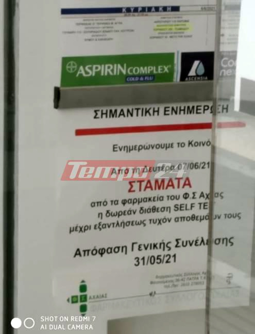 Δεν χορηγούν δωρεάν self test οι φαρμακοποιοί της Πάτρας με απόφαση της γενικής συνέλευσης του Φαρμακευτικού Συλλόγου Αχαΐας, με αποτέλεσμα από το πρωί να έχουν δημιουργηθεί εντάσεις με πολίτες που τα χρειάζονται για να προσέλθουν στην εργασία τους.