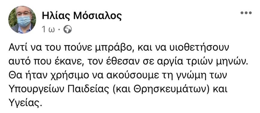 Συγκεκριμένα, ο Ηλίας Μόσιαλος έγραψε στο κείμενο του: «Αντί να του πούνε μπράβο, και να υιοθετήσουν αυτό που έκανε, τον έθεσαν σε αργία τριών μηνών. Θα ήταν χρήσιμο να ακούσουμε τη γνώμη των Υπουργείων Παιδείας (και Θρησκευμάτων) και Υγείας».