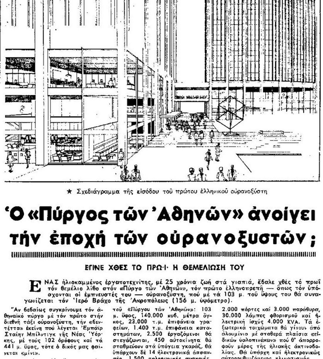 Το καλοκαίρι του 1968 οι Αθηναίοι μαθαίνουν πως η πόλη τους θα αποκτήσει τον πρώτο ουρανοξύστη. Αν μη τι άλλο πρόκειται για μια εντυπωσιακή είδηση. Μια είδηση για την οποία έπρεπε να φτιαχτεί ένας ολόκληρος νόμος! Πρόκειται για τον 395/68 «Περί του ύψους των οικοδομών και ελευθέρας δομήσεως».