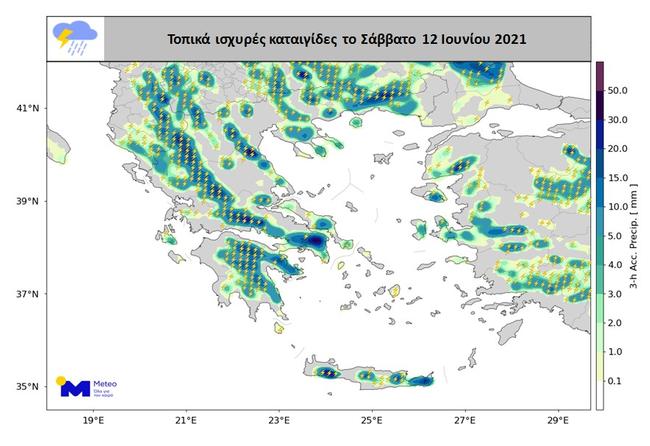 Οι καταιγίδες κατά τόπους θα συνοδεύονται από αυξημένη ηλεκτρική δραστηριότητα, ενισχυμένους ριπαίους ανέμους και σε ορισμένες περιπτώσεις από χαλαζοπτώσεις (μικρού μεγέθους).