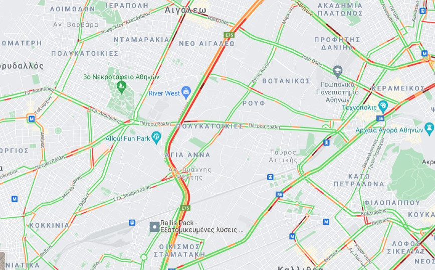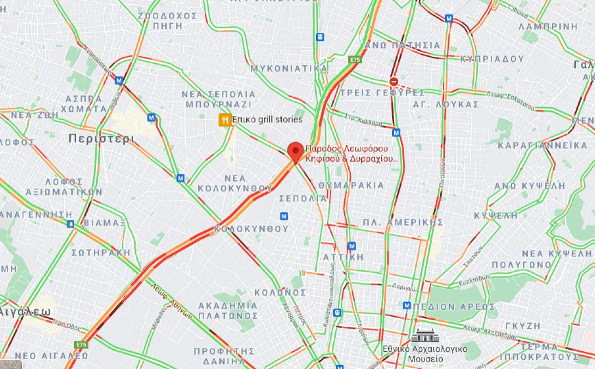 Όπως φαίνεται και από τον χάρτη της Google η κίνηση είναι αυξημένη σε όλο το ρεύμα ανόδου του Κηφισού μέχρι τις Τρεις Γέφυρες.