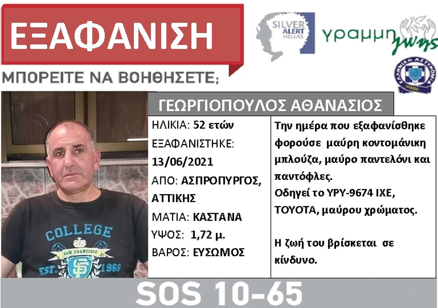 Ο Αθανάσιος Γ, 52 ετών, εξαφανίστηκε την 13/06/21 από το σπίτι του, στον Ασπρόπυργο Αττικής. Έχει καστανά μάτια, ύψος 1,72μ και είναι εύσωμος.
