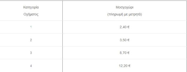 Κατά τη διάρκεια της διακοπής της κυκλοφορίας στην Κοιλάδα των Τεμπών, οι τιμές διοδίων του Σταθμού Διοδίων Μοσχοχωρίου -μόνο για την πληρωμή με μετρητά- θα διαμορφωθούν ως εξής :