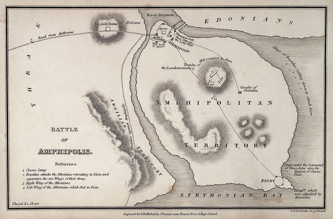 Η περίφημη μάχη της Αμφίπολης έλαβε χώρα το 422 π.Χ., φέρνοντας αντιμέτωπους τους Σπαρτιάτες, υπό τον Βρασίδα, και τους Αθηναίους, υπό τον Κλέωνα.
