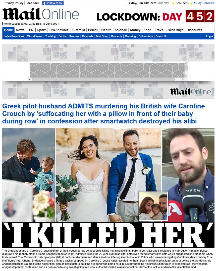 Η βρετανική Daily Mail, στην ηλεκτρονική της μορφή γράφει στον τίτλο της: «Ο σύζυγος ομολόγησε ότι σκότωσε τη Βρετανίδα σύζυγό του Καρολάιν Κράουτς προκαλώντας της ασφυξία με ένα μαξιλάρι μπροστά στο παιδί τους, όπως ομολόγησε κι αφού το smartwatch κατέστρεψε το άλλοθί του».