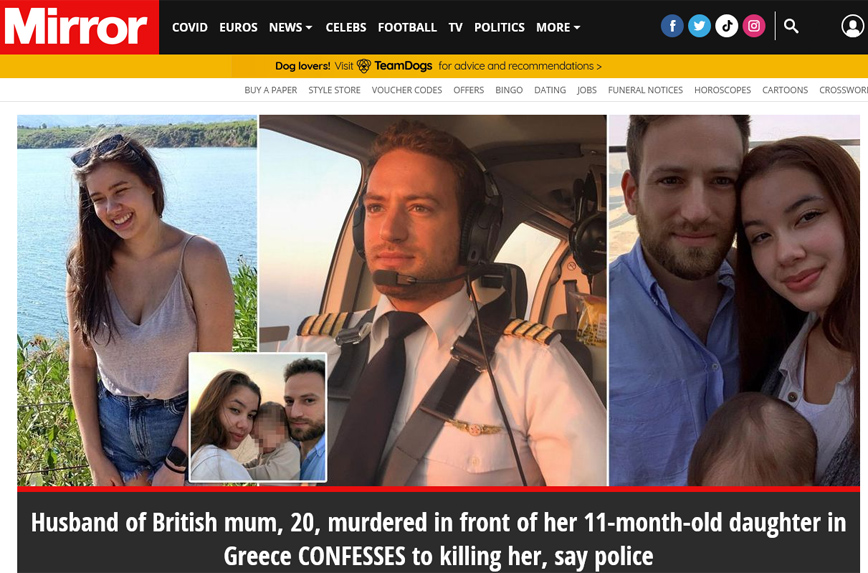 Η Mirror γράφει: «”Ο Έλληνας σύζυγος ομολόγησε ότι σκότωσε την 20χρονη Βρετανίδα μαμά μπροστά στην μόλις 11 μηνών κόρη τους” λέει η αστυνομία».