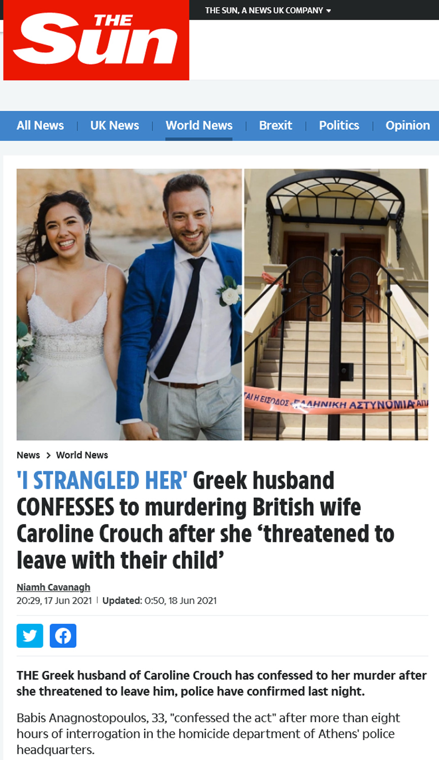 Η Sun φιγουράρει στο πρωτοσέλιδό της την ομολογία δολοφονίας από τον 33χρονο και αναφέρει: «Την έπνιξα. Ο Έλληνας σύζυγος ομολόγησε ότι δολοφόνησε τη Βρετανίδα γυναίκα του Καρολάιν Κράουτ αφότου εκείνη τον απείλησε πως θα έφευγε με το παιδί τους».