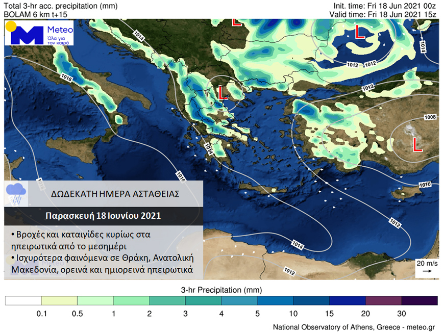 Σύμφωνα με τα τελευταία προγνωστικά δεδομένα του Εθνικού Αστεροσκοπείου Αθηνών / meteo.gr, βροχές και καταιγίδες θα σημειωθούν από το μεσημέρι της Παρασκευής κυρίως στην ηπειρωτική χώρα και στα νησιά του Βορείου και Ανατολικού Αιγαίου.