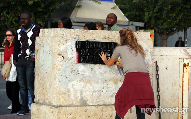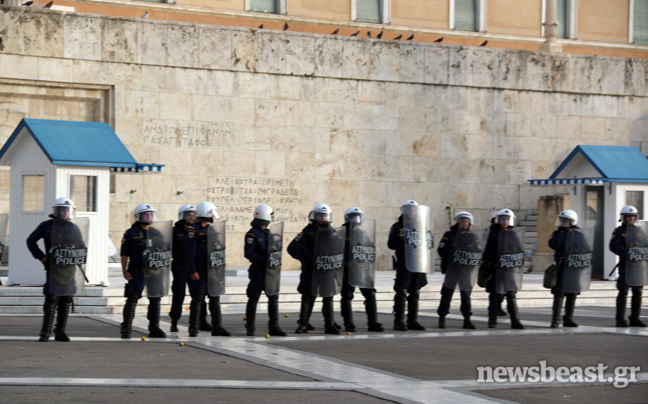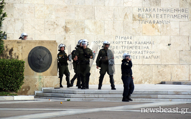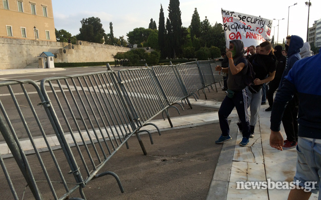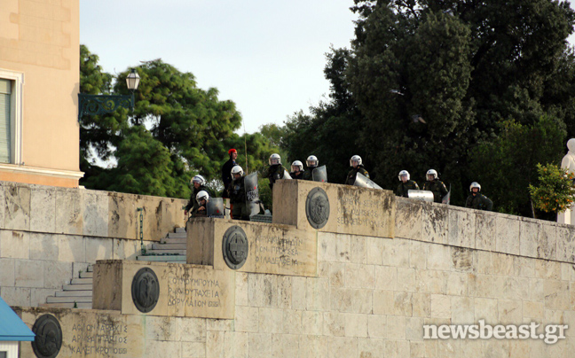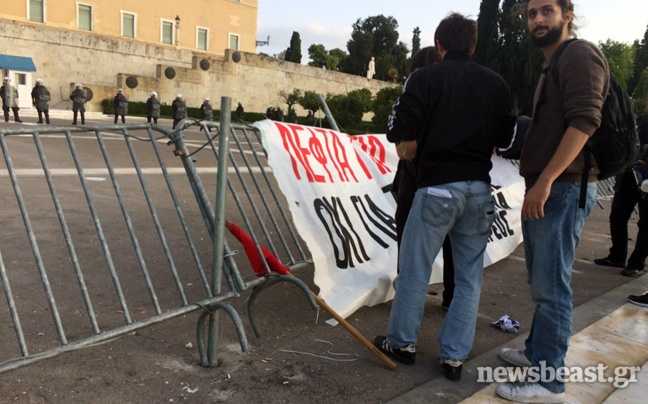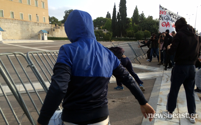 Άγνωστα άτομα που φορούσαν κουκούλες άρχισαν να σπρώχνουν τον σιδερένιο φράχτη που έχει τοποθετηθεί στο προαύλιο της Βουλής, με αποτέλεσμα να πάρει κλίση προς τα κάτω. Τη στιγμή εκείνη τα ΜΑΤ έκαναν την εμφάνισή τους και απομακρύνθηκαν οι εύζωνες από τις θέσεις τους.