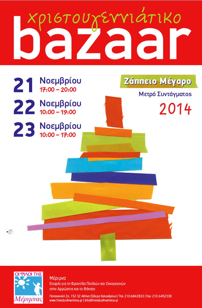 To ενδέκατο χριστουγεννιάτικο bazaar των «Φίλων της Μέριμνας» θα γίνει φέτος στο Ζάππειο Μέγαρο, την Παρασκευή, 21 Νοεμβρίου 17.00-20.00, το Σάββατο 10.00-19.00 και την Κυριακή, 23 Νοεμβρίου 10.00-17.00.