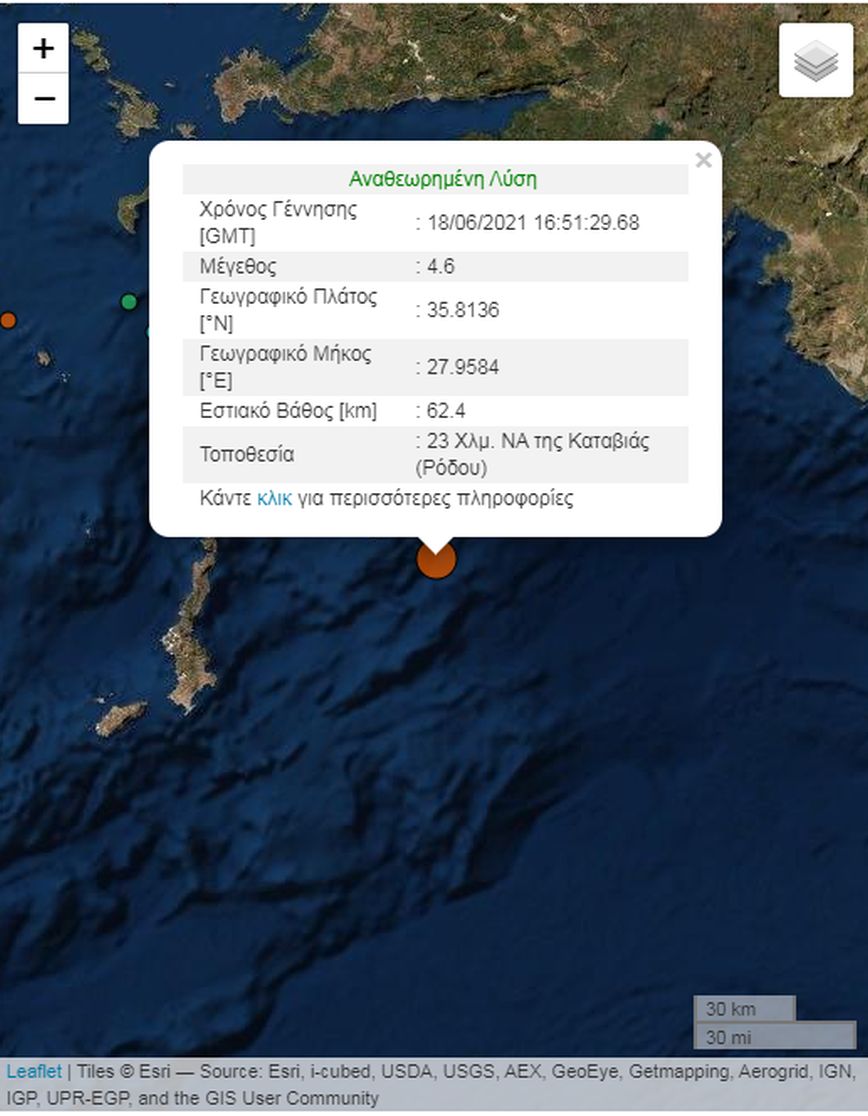 Σεισμός μεγέθους 4,6 βαθμών της κλίμακας Ρίχτερ σημειώθηκε λίγο πριν τις 20:00 στη θαλάσσια περιοχή ανοιχτά της Ρόδου.