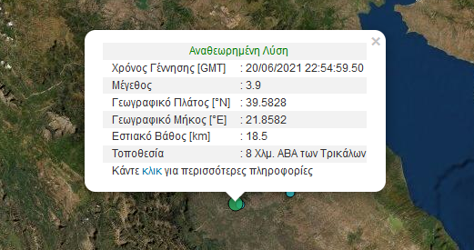 Σύμφωνα με τα στοιχεία του Γεωδυναμικού Ινστιτούτου Αθηνών, ο σεισμός είχε ένταση 3,9 Ρίχτερ, ενώ το επίκεντρο εντοπίστηκε 8 χλμ. ΑΒΑ των Τρικάλων. Το εστιακό βάθος της δόνησης προσδιορίστηκε στα 18.5 χλμ.
