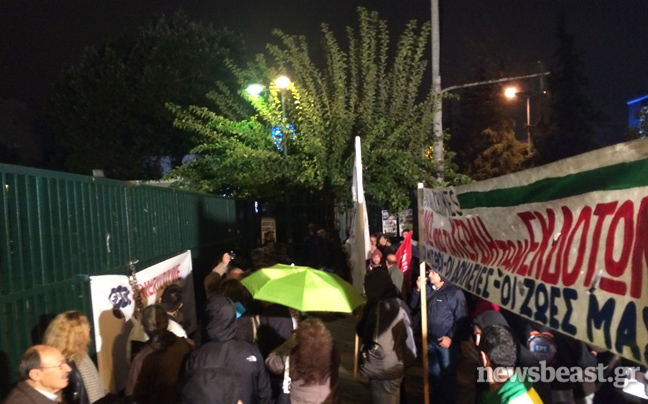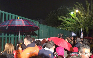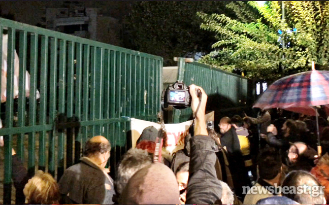 Οι διαδηλωτές παραμένουν συγκεντρωμένοι έξω από κτίριο της ΝΕΡΙΤ κρατώντας ομπρέλες, ενώ κάποιοι εξ αυτών κρέμασαν πανό, αλλά και ένα λουκέτο στα κάγκελα του μεγάρου.