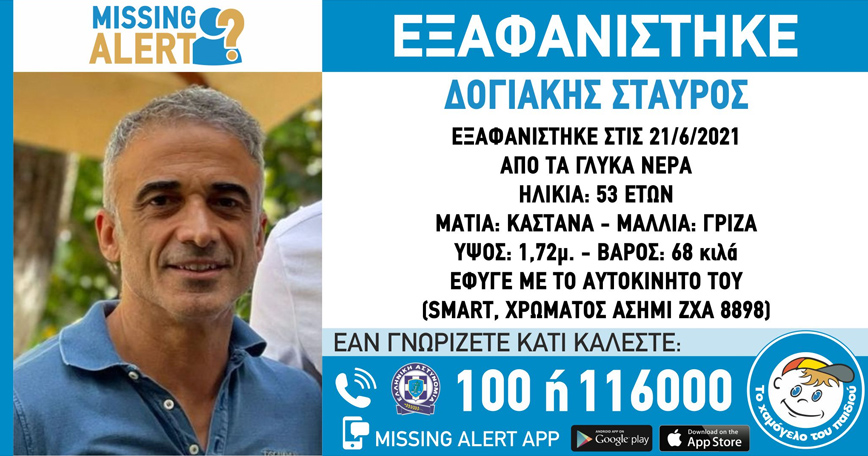 Συναγερμός έχει σημάνει στα Γλυκά Νερά για έναν 53χρονο που εξαφανίστηκε χθες Δευτέρα 21 Ιουνίου.