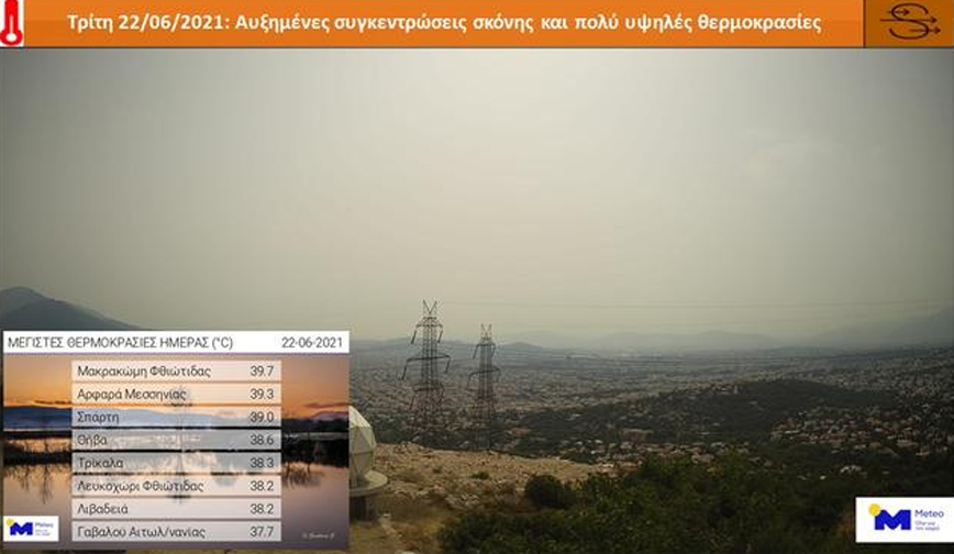 Οι υψηλότερες μέγιστες θερμοκρασίες που καταγράφηκαν ήταν σε Μακρακώμη Φθιώτιδας (39,7 βαθμοί), Αρφαρά Μεσσηνίας (39,3), Σπάρτη (39), Θήβα (38,6) και Τρίκαλα (38,3).