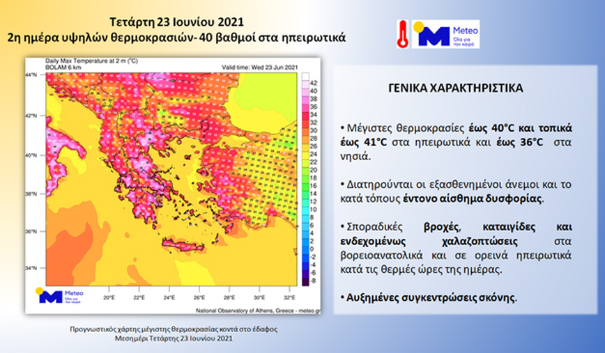 Σύμφωνα με τα τελευταία προγνωστικά δεδομένα του Εθνικού Αστεροσκοπείου Αθηνών/meteo.gr θα σημειωθεί περαιτέρω άνοδος της θερμοκρασίας με αποτέλεσμα το θερμόμετρο να ξεπεράσει τους 40 βαθμούς Κελσίου. Κατά τόπους -όχι πανελλαδικά- θα επικρατήσουν συνθήκες που μπορούν να χαρακτηριστούν ως καύσωνας.