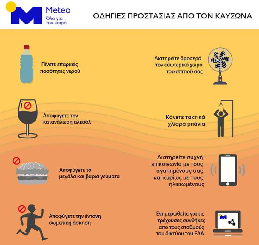 Υπενθυμίζουμε ότι λόγω των υψηλών θερμοκρασιών θα πρέπει να τηρούνται τα απαραίτητα μέτρα προφύλαξης, τα κυριότερα εκ των οποίων παρουσιάζονται συνοπτικά στο παρακάτω γράφημα.