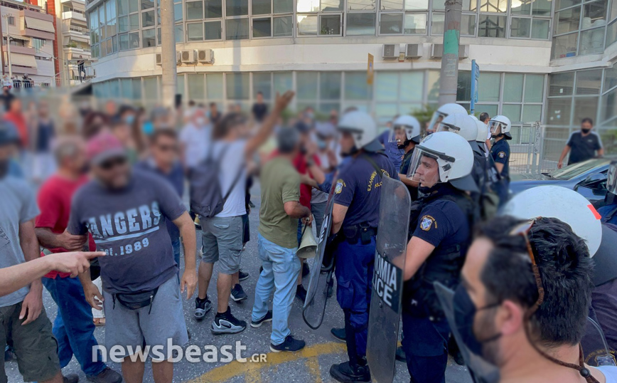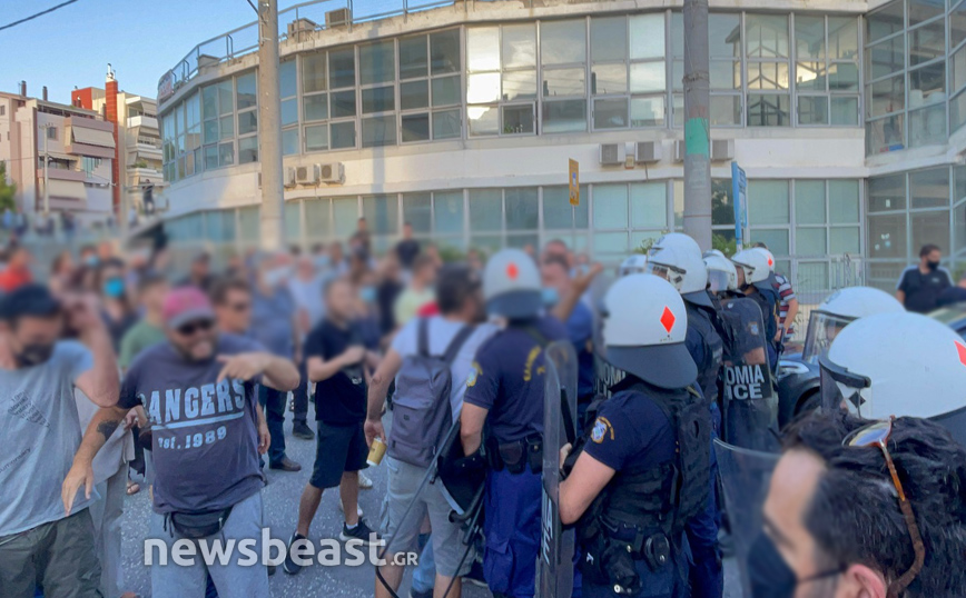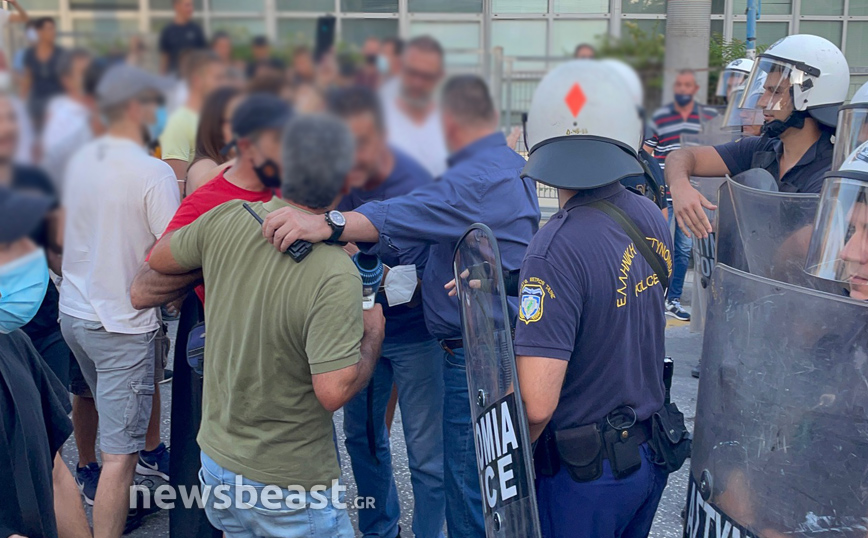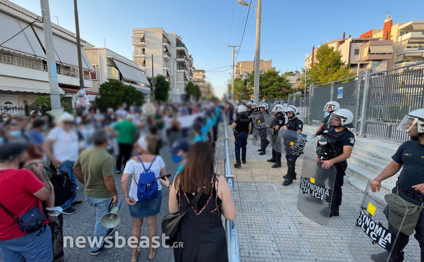 ΟΛΜΕ, ΕΛΜΕ, γονείς και μαθητές βρίσκονται συγκεντρωμένοι και περικυκλωμένοι από αστυνομικές δυνάμεις έξω από το κτίριο, με τους αστυνομικούς να μην επιτρέπουν στο πλήθος να πλησιάσει την είσοδο, ενώ νωρίτερα σημειώθηκε ένταση ανάμεσα στους διαδηλωτές και τα ΜΑΤ.