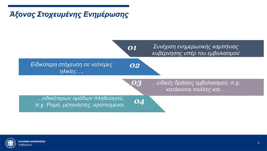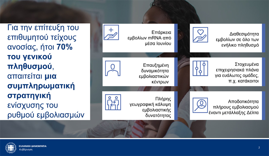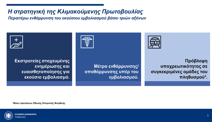 Όπως εξήγησε ο υπουργός Επικρατείας, Γιώργος Γεραπετρίτης η κυβέρνηση υιοθέτησε πλήρως το πόρισμα της Επιτροπής Βιοηθικής η οποία είχε μιλήσει για τρεις πυλώνες στρατηγικής. Ο πρώτος είναι η πειθώ. Ο δεύτερος είναι οι διευκολύνσεις για όσους έχουν εμβολιαστεί. Ο τρίτος πυλώνας είναι η υποχρεωτικότητα του εμβολιασμού σε μονάδες υγείας κ.α. «Αυτό που εισηγούμεθα είναι η διαβαθμισμένη κάλυψη σε χώρους που δεν είναι ουσιωδώς σημασίας», εξήγησε όπως κλειστοί (εστιατόρια κλπ) ή ανοιχτοί με συνωστισμό (γήπεδα, συναυλίες κλπ).