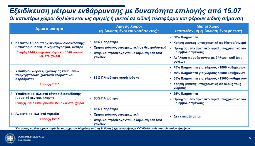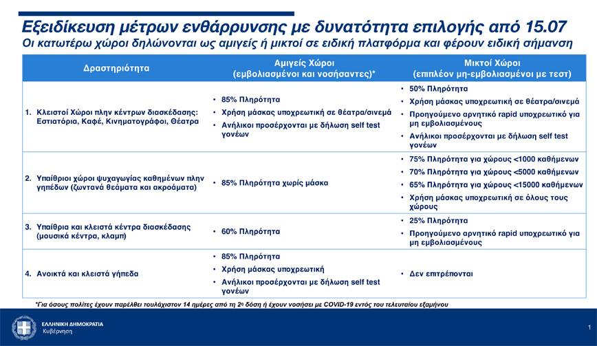 -Στους μεικτούς χώρους θα έχουν πρόσβαση όσοι έχουν αποκτήσει ανοσία, δηλαδή έχουν εμβολιαστεί με δύο δόσεις εμβολίου ή με μονοδοσικό εμβόλιο, και έχουν μεσολαβήσει 14 ημέρες από τον τελικό εμβολιασμό τους, ή έχουν αποδεδειγμένα νοσήσει τους τελευταίους έξι (6) μήνες ή έχουν υποβληθεί σε τεστ ανίχνευσης της νόσου COVID-19 (PCR test ή rapid test) με αρνητικό αποτέλεσμα κατά τις τελευταίες 48 ώρες.