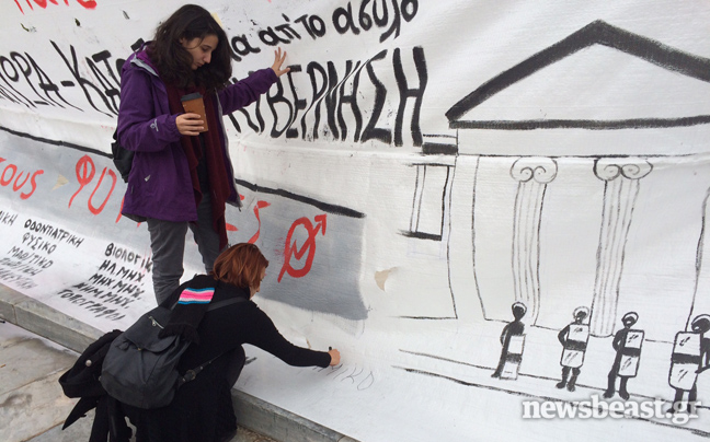 Στο σημείο έχει στηθεί μικροφωνική και οι διαδηλωτές διαβάζουν ανακοινώσεις, ενώ στην κινητοποίηση συμμετέχουν και εκπρόσωποι της ΟΛΜΕ.