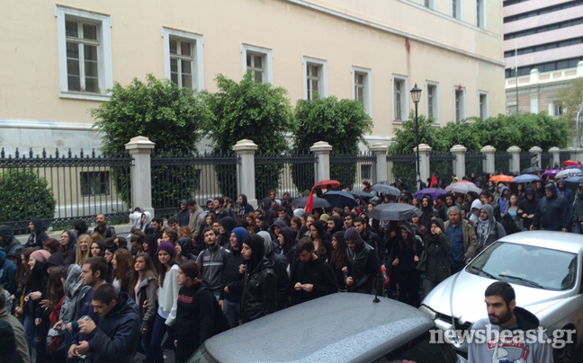 Μια διμοιρία των ΜΑΤ βρίσκεται μπροστά από το κεντρικό κτίριο του Πανεπιστημίου, στην οδό Πανεπιστημίου, ενώ αστυνομικές δυνάμεις υπάρχουν και στους γύρω δρόμους.