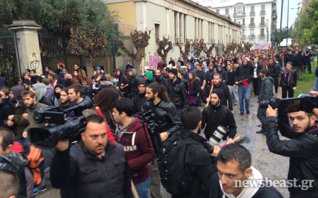 Μέσα στον χώρο του Πολυτεχνείου εισήλθαν οι διαδηλωτές που πραγματοποίησαν νωρίτερα πορεία από τα Προπύλαια, με ενδιάμεση στάση τη Βουλή, στο πλαίσιο του πανεκπαιδευτικού συλλαλητηρίου που πραγματοποιείται σήμερα στον απόηχο των χθεσινών επεισοδίων σε Νομική και ΕΜΠ.