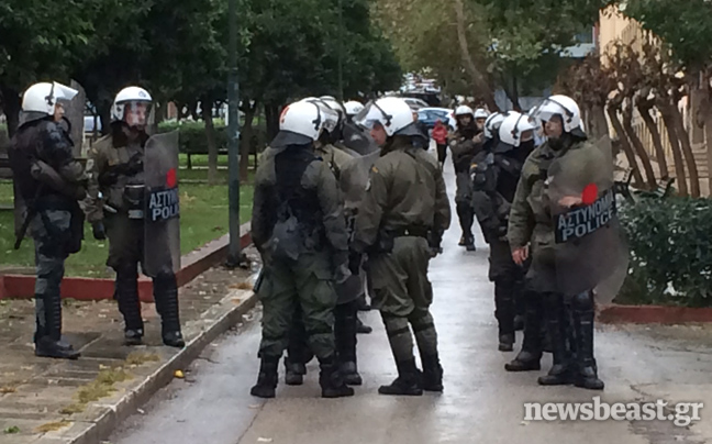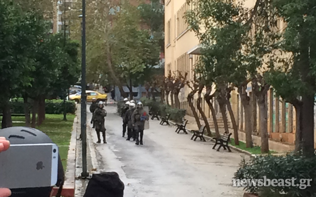 Αυτή την ώρα διμοιρίες των ΜΑΤ παραμένουν μπροστά από την είσοδο του Πολυτεχνείου στην Τοσίτσα.