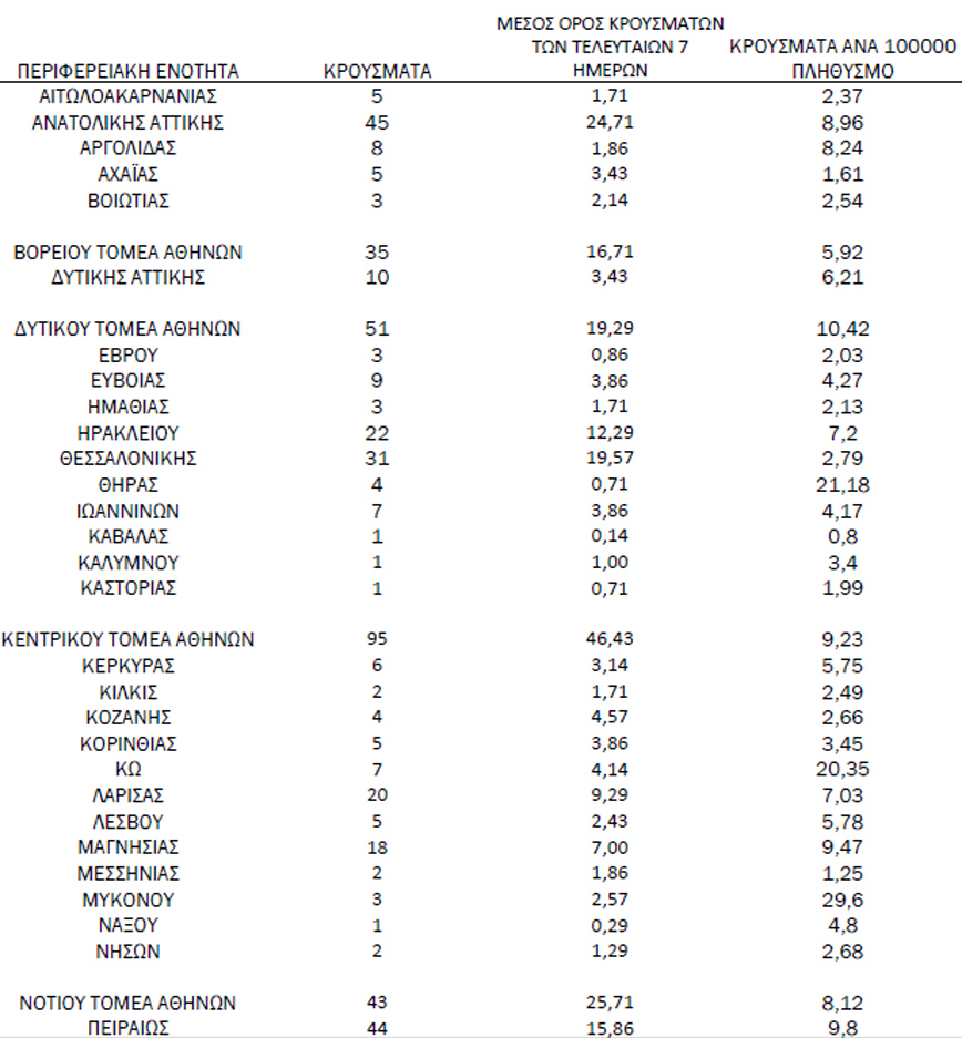 Συγκεκριμένα η Αττική έχει 315 νέα κρούσματα κορονοϊού, με τα 85 από αυτά να εντοπίζονται στο κέντρο της Αθήνας. Παράλληλα η Θεσσαλονίκη έχει 31 νέα περιστατικά.
