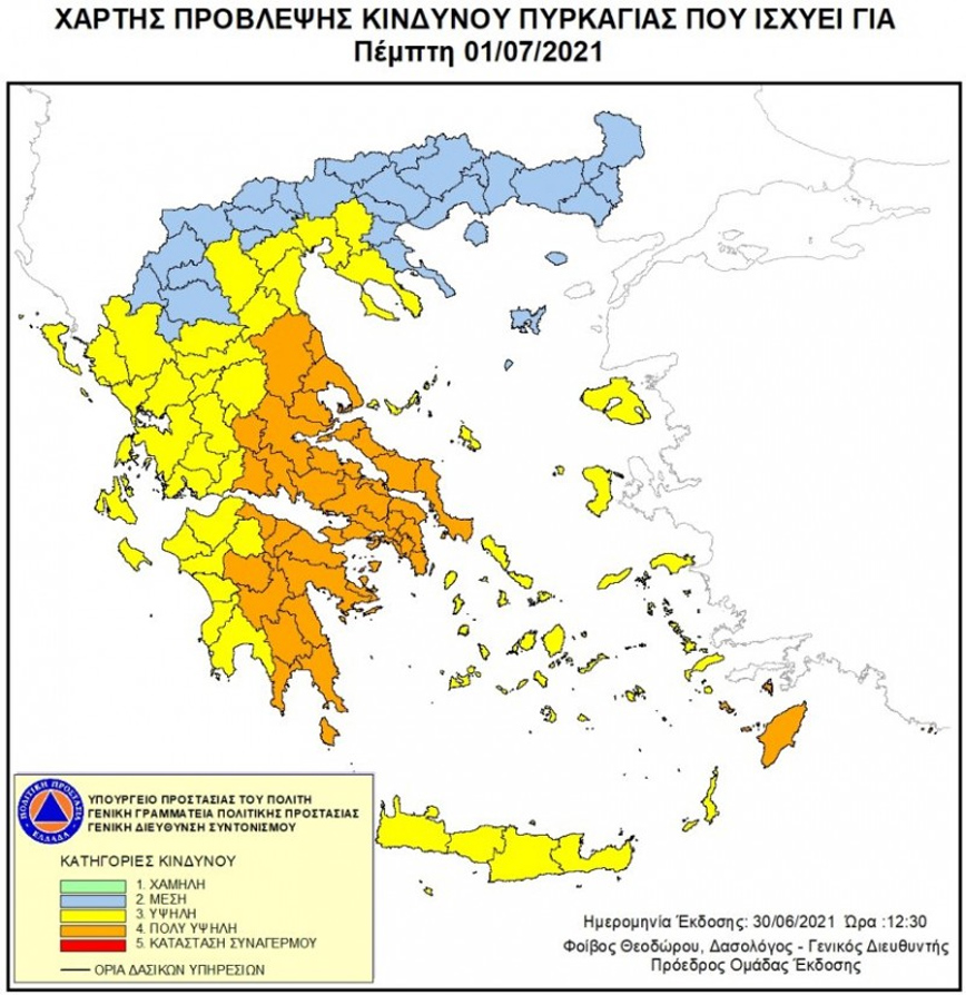 Ο κίνδυνος πυρκαγιάς είναι σήμερα πολύ υψηλός (κατηγορία κινδύνου 4) σύμφωνα με τον Χάρτη Πρόβλεψης Κινδύνου Πυρκαγιάς που εκδίδει η Γενική Γραμματεία Πολιτικής Προστασίας του Υπουργείου Προστασίας του Πολίτη (www.civilprotection.gr).