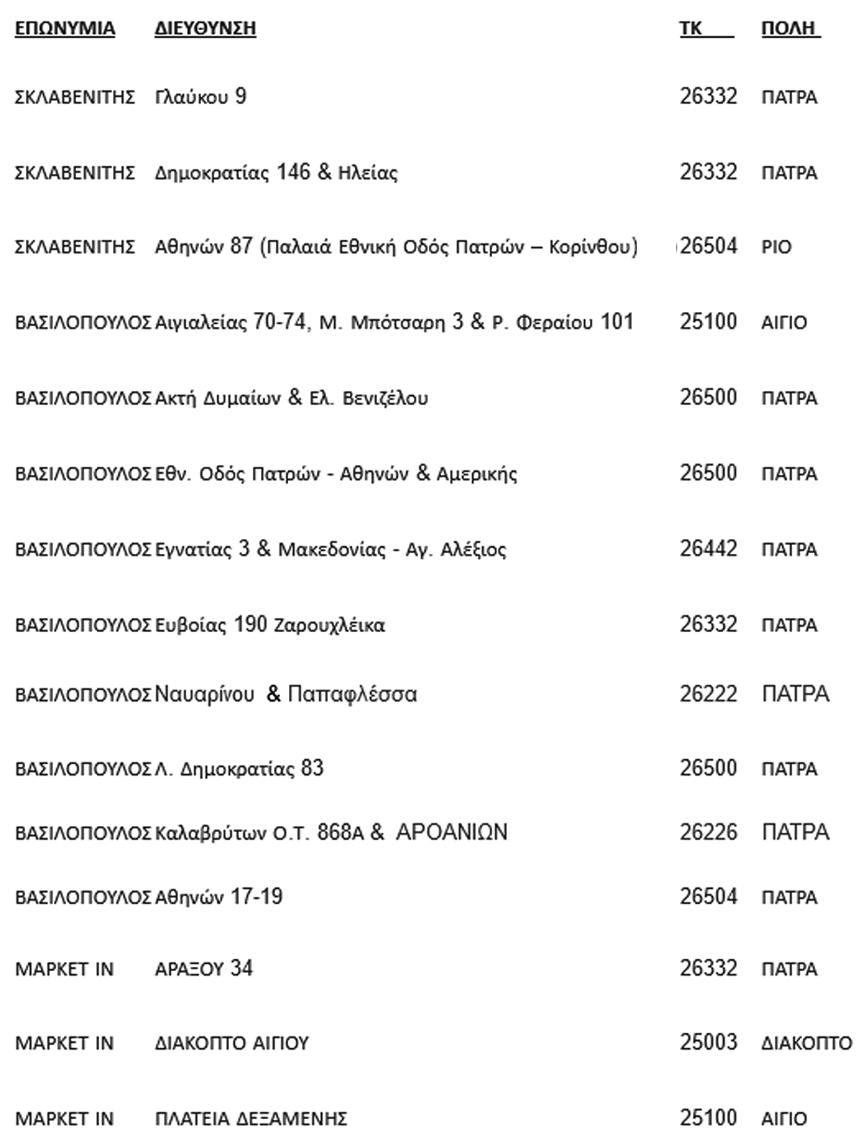 Τα καταστήματα των σούπερ μάρκετ τα οποία συμμετέχουν είναι τα εξής: