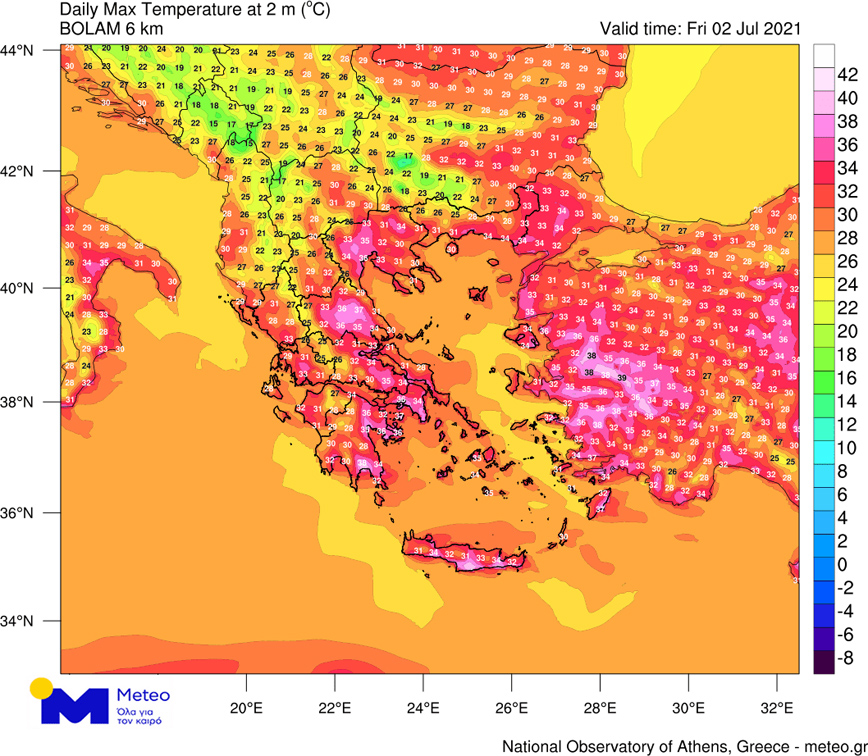 Ειδικότερα, την Παρασκευή 2 Ιουλίου 2021, οι υψηλότερες θερμοκρασίες να αναμένονται και πάλι στα ανατολικά ηπειρωτικά και στην Κρήτη όπου ο υδράργυρος θα φτάσει τοπικά τους 40°C (Χάρτης 1).