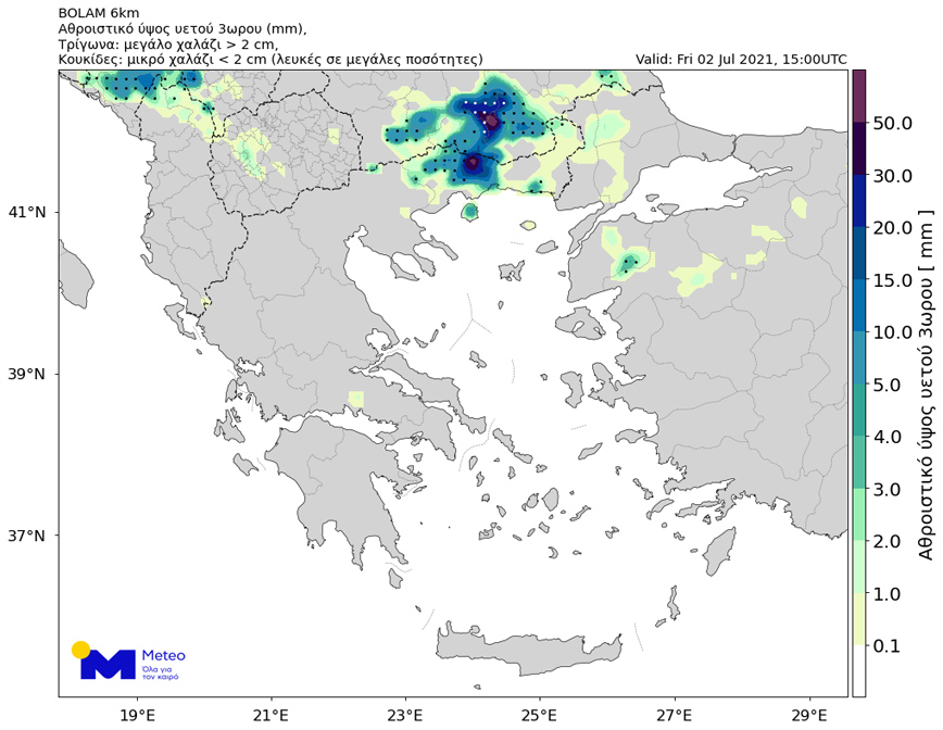 Ο επόμενος χάρτης (Χάρτης 2) δείχνει τις περιοχές όπου προβλέπονται να πλήξουν οι καταιγίδες στη Βορειοανατολική Ελλάδα το απόγευμα της Παρασκευής 02/07, με ισχυρές βροχοπτώσεις, ισχυρούς ανέμους και χαλαζοπτώσεις.