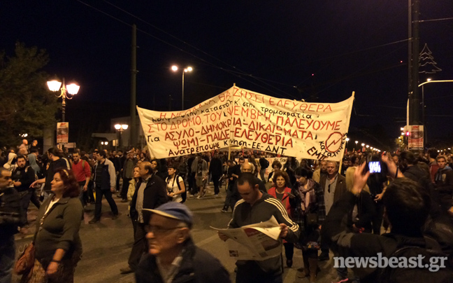 Οι διαδηλωτές έχουν περάσει το Χίλτον και πλέον πλησιάζουν στο σημείο όπου βρίσκεται και η κεφαλή της πορείας.