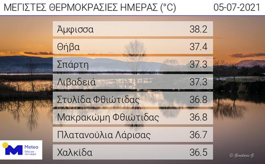 Οι υψηλότερες θερμοκρασίες το μεσημέρι της Δευτέρας σημειώθηκαν στην Άμφισσα (38,2), στη Θήβα (37,4), στη Σπάρτη (37,3) και στη Λιβαδειά (37,3). Αύριο αναμένεται μικρή άνοδος της μέγιστης θερμοκρασίας.
