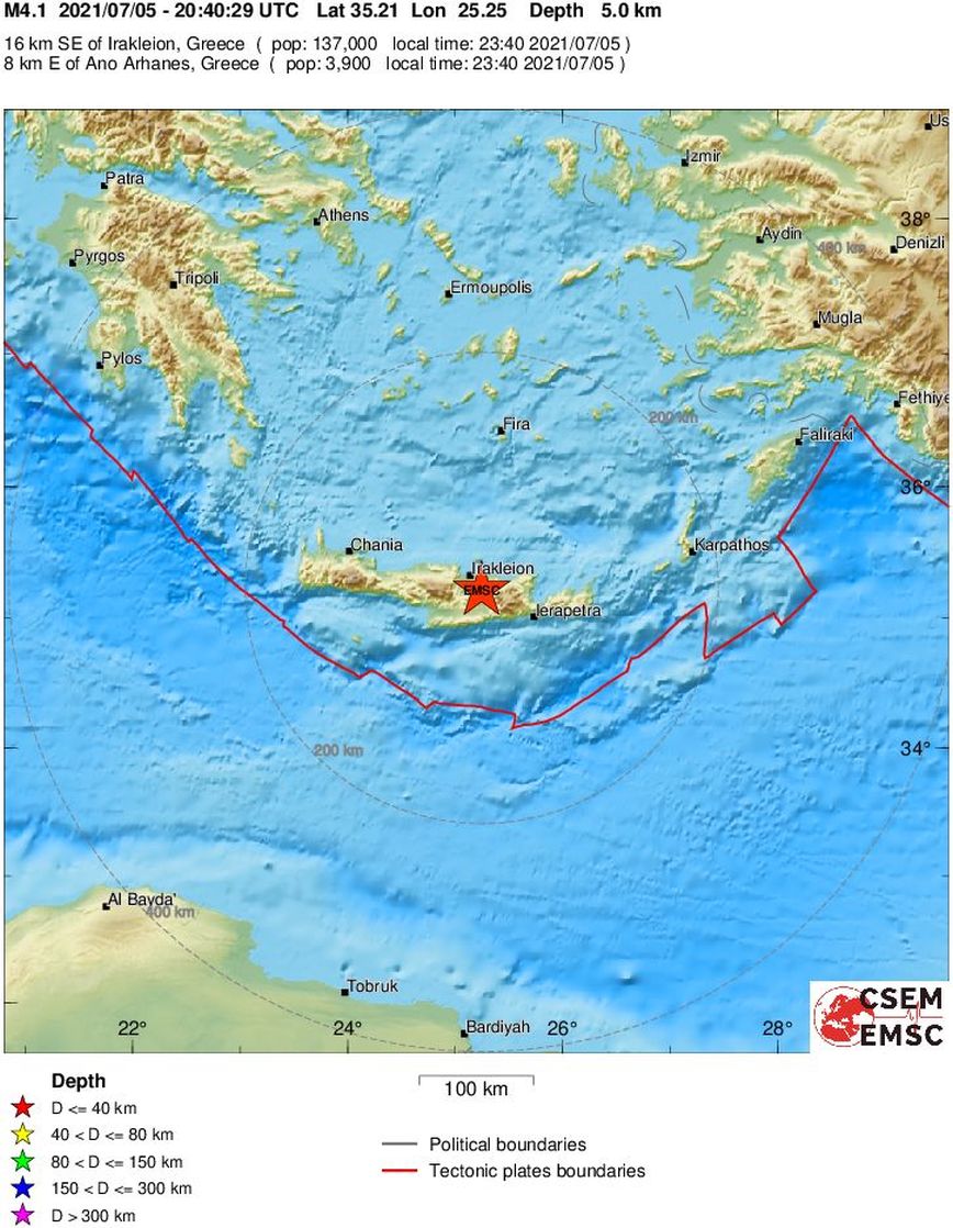 Σεισμική δόνηση μεγέθους 4,2 βαθμών της κλίμακας Ρίχτερ σημειώθηκε πριν από λίγα λεπτά στην Κρήτη. Το επίκεντρο του σεισμού εντοπίστηκε στα 17 χιλιόμετρα νότια, νοτιοανατολικά του Ηρακλείου, σε μικρή απόσταση από το χωριό Αρχάνες. Το εστιακό βάθος της δόνησης μετρήθηκε στα 2 χιλιόμετρα.