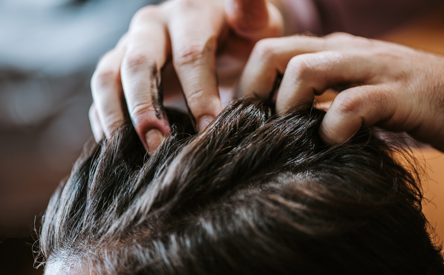 Στη συνέχεια, χρησιμοποιώντας και τα δύο χέρια, κάντε μασάζ στα μαλλιά σας, από πίσω προς τα εμπρός, και από την ρίζα στην άκρη.