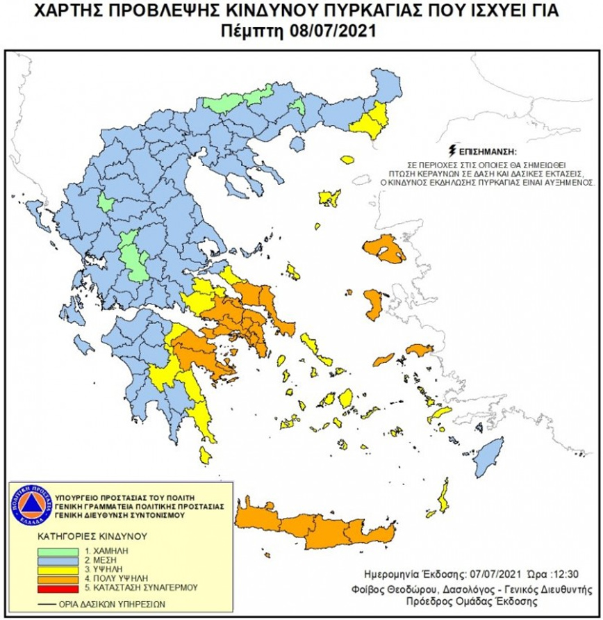 Πολύ υψηλός είναι σήμερα ο κίνδυνος πυρκαγιάς (κατηγορία κινδύνου 4) σε πέντε περιφέρειες. Σύμφωνα με τον Χάρτη Πρόβλεψης Κινδύνου Πυρκαγιάς που εκδίδει η Γενική Γραμματεία Πολιτικής Προστασίας οι περιφέρειες αυτές είναι: