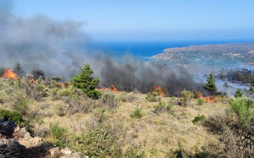 Οι δυνάμεις που επιχειρούν είναι ισχυρές: 42 πυροσβέστες, 5 οχήματα, δύο πεζοπόρα τμήματα, τρία ελικόπτερα και έξι αεροσκάφη.