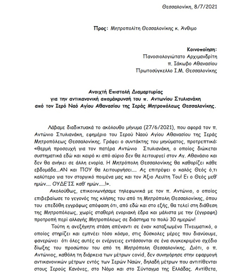 Η φερόμενη απομάκρυνση ενός ιερέα από τον Ι.Ν. Αγίου Αθανασίου, στη Θεσσαλονίκη, εξαιτίας του ότι εμφανίζεται να μην τηρούσε τα προβλεπόμενα μέτρα για τον κορονοϊό, κατά το thestival.gr, προκάλεσε την αντίδραση ορισμένων πιστών, οι οποίοι βρέθηκαν έξω από την Μητρόπολη της πόλης νωρίτερα σήμερα, προκειμένου να διαμαρτυρηθούν.
