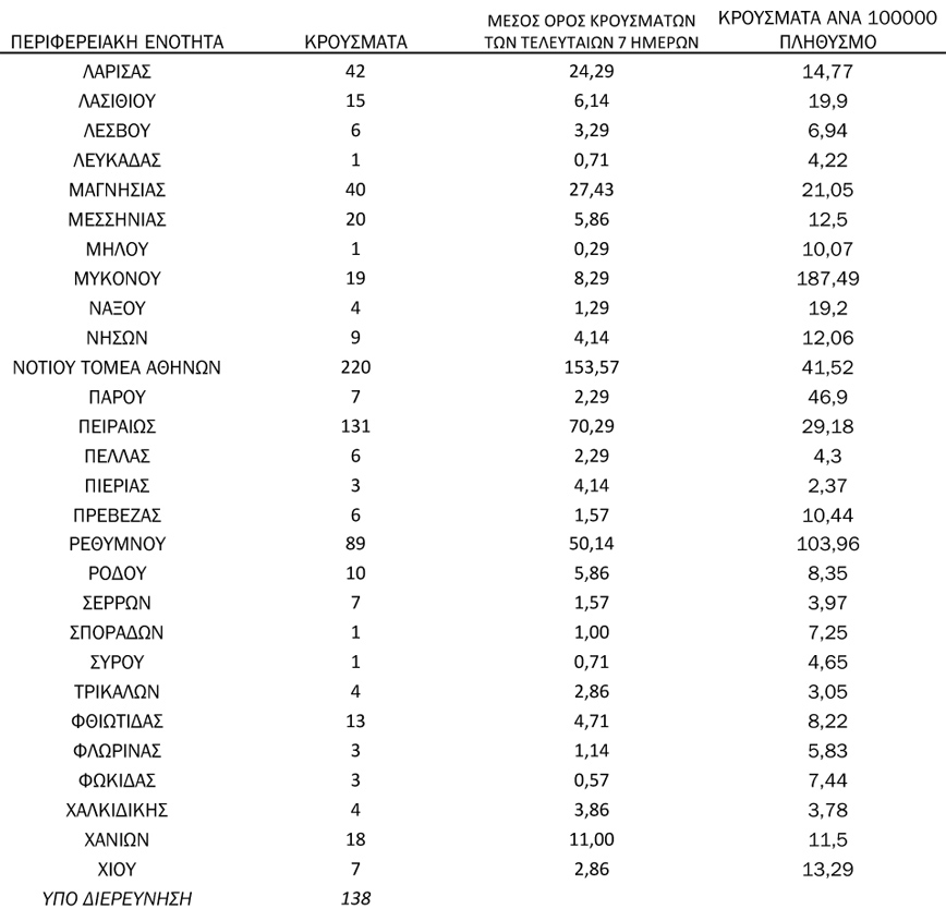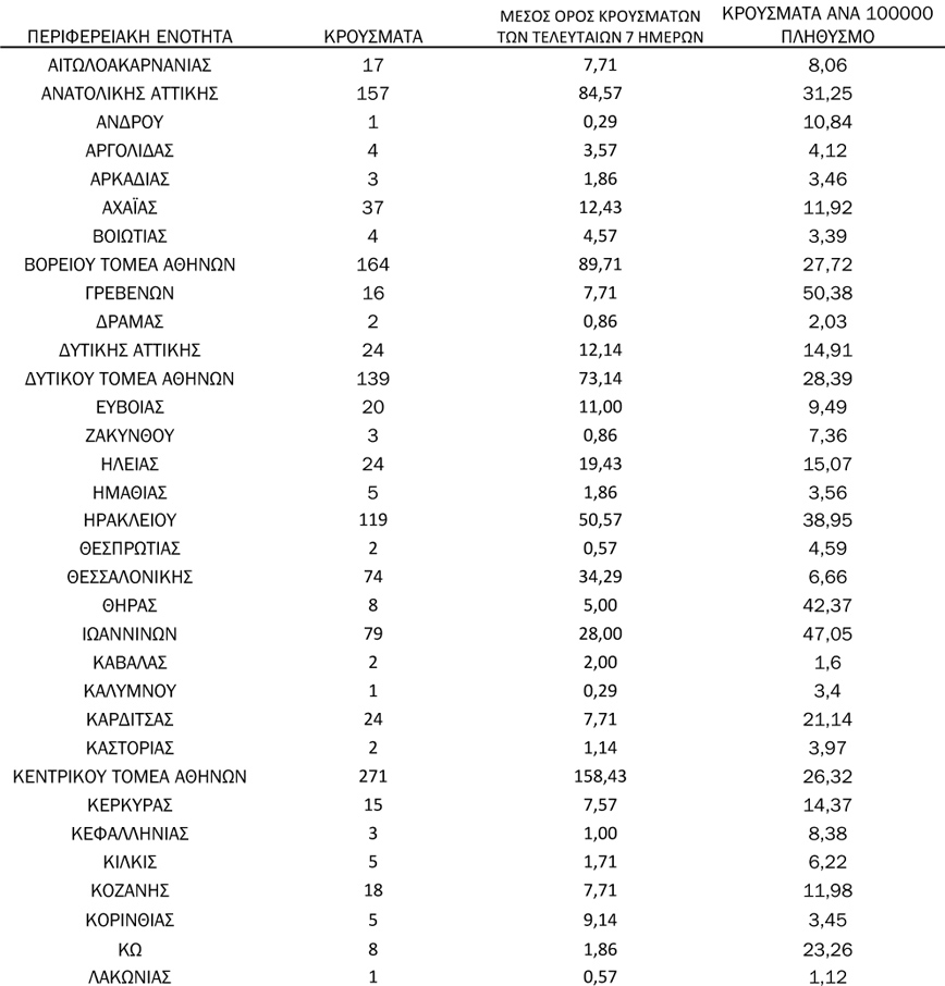 Συγκεκριμένα η Αττική έχει 1.115 νέα κρούσματα κορονοϊού, το κέντρο της Αθήνας 271 και ο Νότιος Τομέας της πόλης 220.