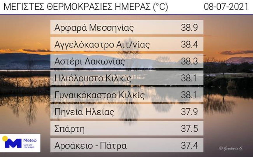 Τους 39 βαθμούς Κελσίου πλησίασε η μέγιστη θερμοκρασία σήμερα Πέμπτη (8/7) με τις υψηλότερες θερμοκρασίες να έχουν καταγραφεί στα Αρφαρά Μεσσηνίας (38,9) και ακολούθησαν Αγγελόκαστρο Αιτωλοακαρνανίας (38,4) και Αστέρι Λακωνίας (38,3 βαθμοί), σύμφωνα με το δίκτυο των αυτόματων μετεωρολογικών σταθμών του Εθνικού Αστεροσκοπείου Αθηνών/meteo.gr.