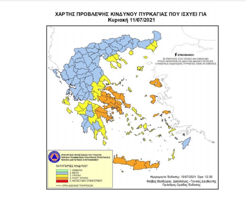 Πολύ υψηλός κίνδυνος πυρκαγιάς (κατηγορία κινδύνου 4) προβλέπεται για αύριο Κυριακή 11 Ιουλίου, για πέντε περιφέρειες της χώρας σύμφωνα με το Χάρτη Πρόβλεψης Κινδύνου Πυρκαγιάς που εκδίδει η Γενική Γραμματεία Πολιτικής Προστασίας του Υπουργείου Προστασίας του Πολίτη (www.civilprotection.gr).