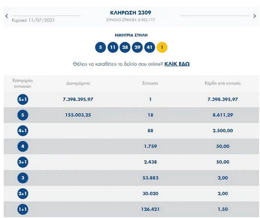 Οι τυχεροί αριθμοί που έβγαλε η κληρωτίδα της κλήρωσης την Κυριακή ήταν οι: 5, 11, 28, 29, 41, και Τζόκερ ο αριθμός 1.