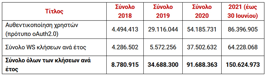 Τέλος, «ο αριθμός των κλήσεων διαλειτουργικότητας για αυτοματοποιημένη διαβίβαση στοιχείων μεταξύ των πληροφοριακών συστημάτων του Δημοσίου ανήλθε σε περίπου 64 εκατομμύρια στο α’ εξάμηνο του 2021, ενώ για όλη την προηγούμενη χρονιά (2020) ήταν 37 εκατομμύρια, δηλαδή πρόκειται για αύξηση της τάξης του 245%».